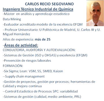 (socioculturales), empresas y organizaciones de Sector industrial (Automoción, Productos Sanitarios, Alimentación); Administración Pública: en Equipos de Mejora. Six Sigma; Lean: VSM, 5S, SMED,