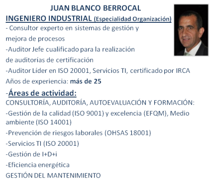 - Servicios profesionales relacionados con la gestión de la calidad (ISO 9001), la excelencia (EFQM), el medio ambiente (ISO 14001), la prevención de riesgos laborales (OHSAS 18001), la gestión de I+D+i y la eficiencia energética. Consultoría, Auditoría, Autoevaluación y Formación.